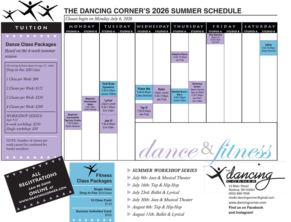 Now under the direction of Jen Post and Erin Oden and an experienced faculty of qualified instructors, The Dancing Corner’s goal is to provide Southern New Hampshire with the finest dance instruction in the greatest variety of styles in the area. We offer a full schedule of classes in Classical Ballet, Pointe, Jazz, Hip Hop, Tap, Lyrical, and Musical Theatre for the serious student. We also offer introductory dance classes for young children and recreational dance classes for beginner to advanced adults. In addition, we offer a fitness track for those interested in strength training and exercise with classes such as WERQ, Mobility Boost, and Total Body Dynamics.